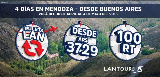 Aplica para compras realizadas entre el día 24/04/15 al  27/04/15.  Precios por persona en base doble. Cupos disponibles: 6.  04/05/15, viaje concluido.  Traslados operan en servicio regular. Operador  responsable:  LANTOURS S.A. Leg 13170, Dom. Legal Cerrito 866 1°piso CABA, CUIT: 30-70952352-6. Oficinas LANTOURS: Cerrito 866 (Centro), Avenida Corrientes 336 (Centro), Avenida Santa Fé 3596 (Palermo), Avenida Cabildo 1072 (Belgrano), Hidalgo 26 (Caballito), Unicenter Shopping (Martínez), Calle Ituzaingó 402 (San Isidro) y Calle 8 Nro. 869 (La Plata).  Diagonal Pueyrredón 3050 (Paseo Diagonal – Mar del Plata) LANTOURS S.A. Leg 13170, Dom. Legal Cerrito 866 1°piso CABA, CUIT: 30-70952352-6.  LAN es marca registrada.