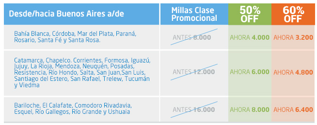 Promociones de “50% Off Millas” y “60% Off Millas” correspondientes al Programa de Aerolíneas Plus, utilización sujeta a bases y condiciones en http://www.aerolineas.com.ar. Para vuelos ida y vuelta desde y hacia Buenos Aires (a/de Aeroparque) y los destinos de Cabotaje, operados por Aerolíneas Argentinas y Austral Líneas Aéreas en cabina Turista. Periodo valido de emisión del 08/05/15 al 16/05/14 inclusive, para volar con salidas permitidas: desde el 27/05/15 y viaje finalizado al 30/06/15, y desde el 01/09/15 y viaje finalizado al 30/11/15 (excepto en los periodos de fines de semana largos. No válida del 09/10/15 al 13/10/15, ni del 20/11/15 al 24/11/15). La Promo “50% Off Millas” es válida para comprar únicamente a través de aerolineas.com (site Argentina), solo para socios Aerolíneas Plus residentes en Argentina . Para la Promo “60% Off Millas” además de estas condiciones, los socios Aerolíneas Plus deberán tener asociadas a su cuenta una tarjeta de crédito Aerolíneas Plus emitida por cualquiera de las entidades bancarios y/o financieras en asociación vigente con Programa Aerolíneas Plus. El total de Millas debe estar disponible en el saldo de la cuenta al momento de la emisión. Menores de 12 años redimen y abonan el 100% de la promoción y no podrán acceder a la misma en forma individual, solo estará permitido que el menor viaje en forma conjunta en una misma reserva viajando con un adulto. No permite cambios de vuelos, fecha, ruta o titularidad. No se admiten open jaw ni endosos. No permite devolución. No acredita millas. Cupos Disponibles: 5.000 plazas distribuidas en todos en los vuelos que Aerolíneas Argentinas determine durante la vigencia de la promoción. Clase de Reserva “P”,