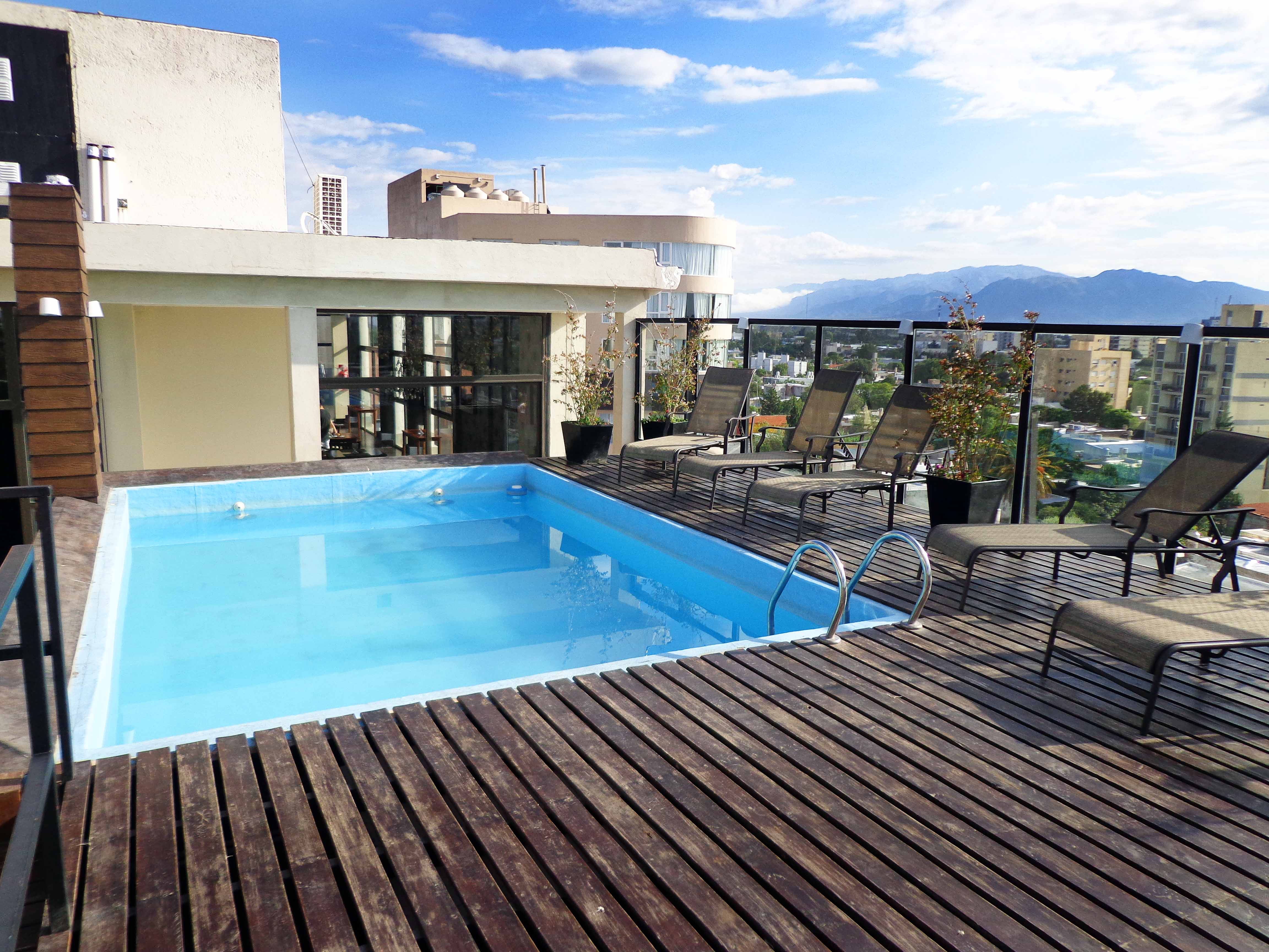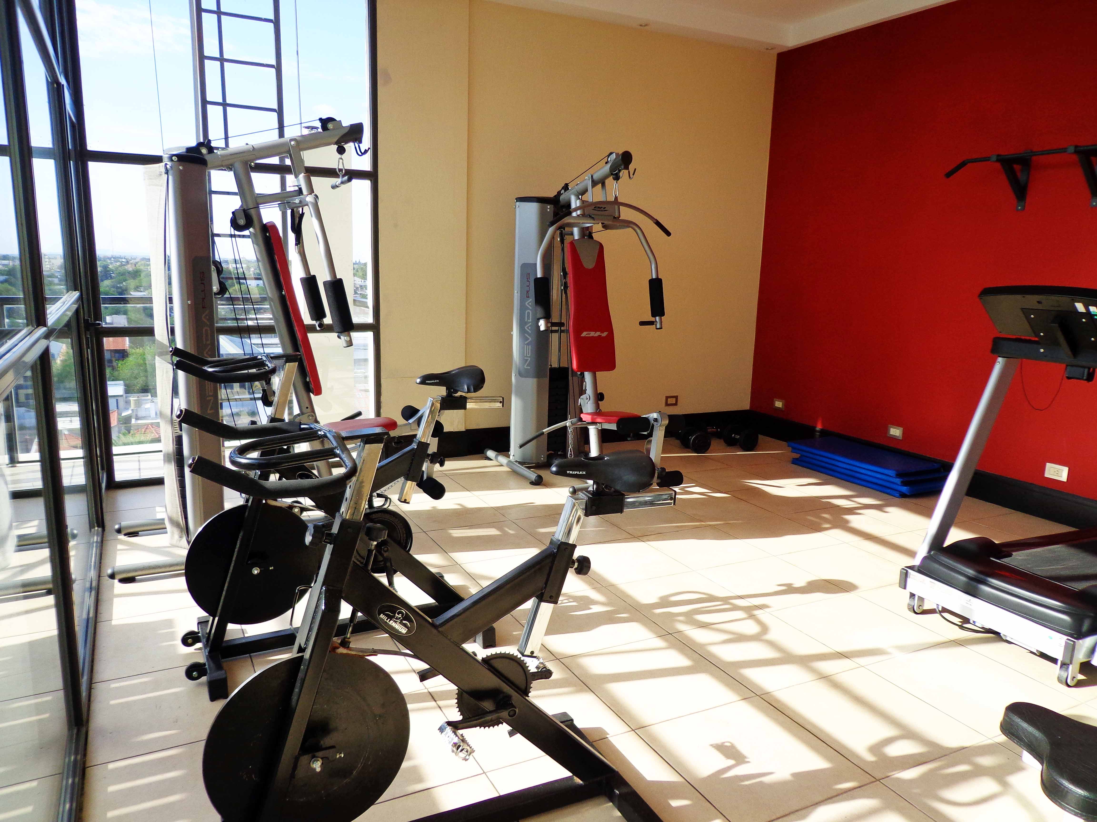 La piscina es externa, un tanto pequeña al igual que el solarium. Posee un mini gimnasio con un par de cintas, bicicletas fijas, y algunos aparatos para complemento.
