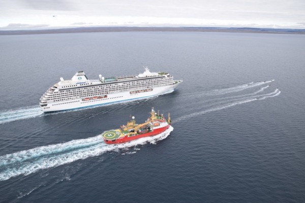 Detalla el autor del artículo los riesgos a que se encuentra expuesto el crucero debido a que en la región, a pesar del calentamiento global, aún quedan bloques de hielo, y que por tal motivo, el buque de trece pisos, debe ser acompañado por un barco rompehielos que dentro de su sofisticado equipamiento, incluye dos helicópteros. Agrega Oremus que los cruceros, aunque no se hundan, igualmente contaminan y dañan al mundo que los rodea.[2]