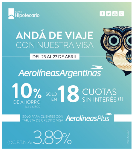 Visa Banco Hipotecario y Aerolíneas Plus 10% off y 18 cuotas sin interés