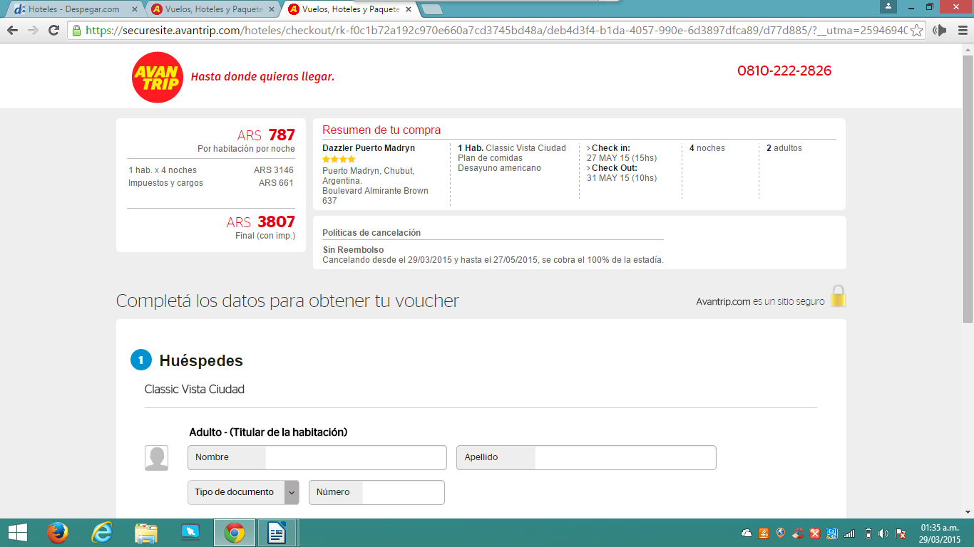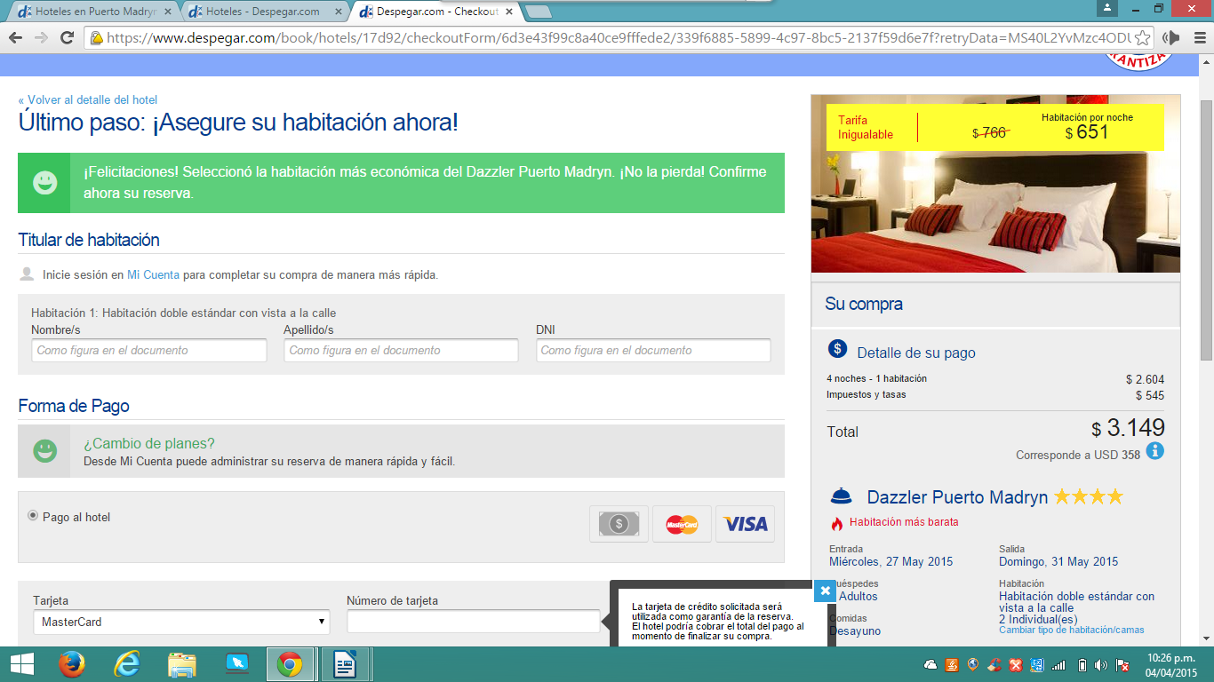 Me decidí por el Hotel Dazzler (4 estrellas), teniendo en cuenta que está de promo en Groupon, y para corroborar la oferta, me puse a comparar precios en diferentes sitios.